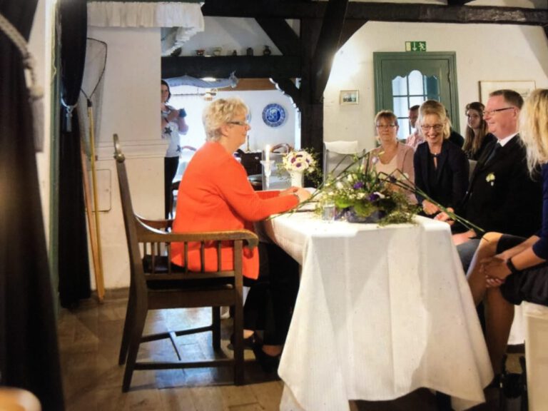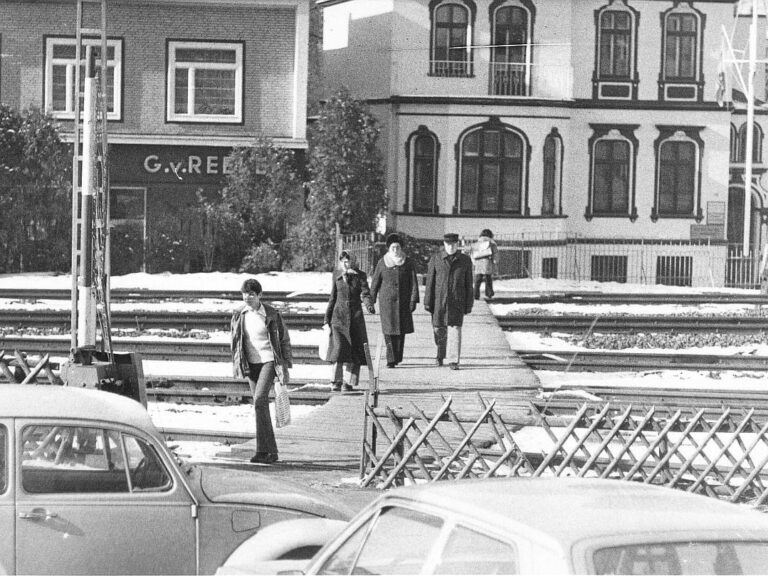 Die Mitteldeichstraße ist wohl die älteste städtische Straße in Brake. Sie verlief, wie ihr Name verrät, im Schutz des Deiches oder auf dem alten Deich. So finden wir hier auch die ältesten noch erhaltenen Häuser unserer Stadt. In diesem Ensemble ist das Fischerhaus, ein eingeschossiges Fachwerkhaus mit Backsteinausfachungen, das älteste, noch erhaltene Gebäude in der Braker Innenstadt. Die Inschrift am Giebel: „Das Wesen dieser Welt vergeht mit ihr Getümmel, drum wehl ich mir zum Sitz das Lustschloss in den Himmel – Anno 1731 Den 2. Augustus.“ passt heute als Leitspruch für die hier vollzogenen Eheschließungen. Die Erbauer, die Eheleute Addicks, waren, trotz der heutigen Bezeichnung, wahrscheinlich keine Fischer. Im 17. und 18. Jahrhundert lebten nur ein paar Familien mehr schlecht als recht von der Fischerei in der Weser. Die Haltung von Ziegen, Schafe, Kühe oder Schweinen und ein eigener Garten ergänzten den kargen Lebensunterhalt. Neben den Fischern und Landwirten ließen sich im 18. Jahrhundert die ersten Handwerker, Kaufleute, Fischer, Kahnschiffer und Lotsen am Strom nieder. Zu letzteren gehörte vermutlich auch Addick Addicks. Mit Beginn einer planvollen Stadtentwicklung und den dadurch günstigeren Grundstücken ab 1790 veränderte sich das Stadtbild Brakes zusehends. Immer mehr Dienstleister und Kaufleute siedelten sich an. Aus der kleinen Siedlung wurde langsam eine Stadt. In direkter Umgebung des Fischerhauses sind Beispiele für diesen Aufschwung zu finden, darunter die Plassmann’sche Villa , die Oltmanns-Villa oder die Packhäuser der Firma Tobias an der Hafenstrasse. Bevor Kaje und Breite Straße angelegt wurden, war hier die Keimzelle des städtischen Lebens. 1834 wurde Brake Freihafen und zählte damals „3969 Einwohner, die bedeutenden Handel, Schiffahrt, nebenbei Wollweberei treiben…Bis zur Gründung von Bremerhaven , war hier die Hauptstation und der eigentliche Hafen der Bremer Seeschiffe und überhaupt das regste Schifferleben an der ganzen Weser“ (Brockhaus Enzyklpädie 1861). Am 1. Mai 1856 schlossen sich die Flecken Brake und Harrien zusammen und erhielten die Stadtrechte des Herzogtums Oldenburg.